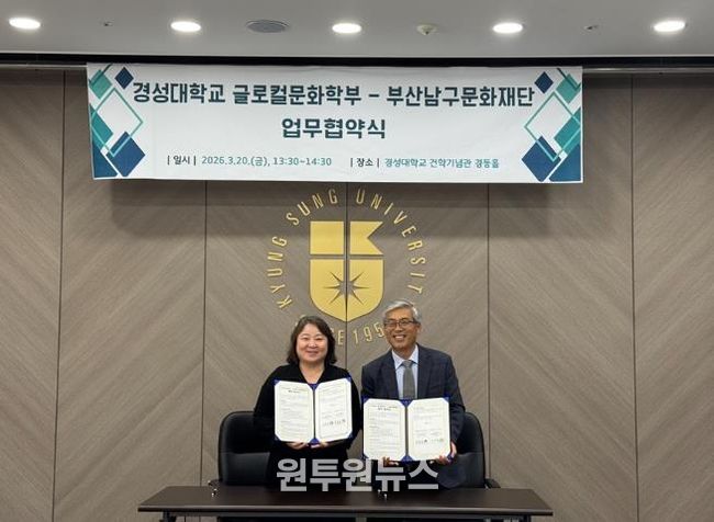 (원투원뉴스) 부산남구문화재단은 지난 3월 20일 경성대학교 경동홀에서 지역문화 활성화를 위한 공동 사업 추진과 인재 양성을 위해 경성대학교 글로컬문화학부와 업무협약(MOU)을 체결했다고 밝혔다.