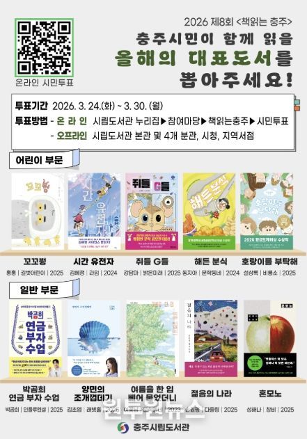 (원투원뉴스) 충주시립도서관은 오는 30일까지 2026년 제8회 ‘책읽는 충주’ 독서운동의 대표 도서 선정을 위한 시민 투표를 실시한다고 24일 밝혔다.