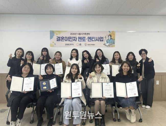 (원투원뉴스) 시흥시는 지난 3월 23일 시흥시가족센터에서 ‘2026년 결혼이민자 멘토‧멘티 사업(구, 다문화가족 서포터즈 운영) 멘토 위촉식’을 열고 러시아, 베트남, 중국, 필리핀, 미얀마, 일본, 캄보디아 7개국 출신 멘토 14명에게 위촉장을 수여했다.