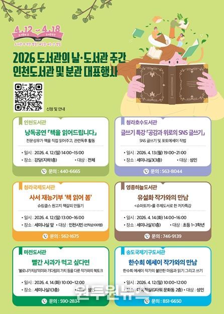 (원투원뉴스) 인천광역시인천도서관은 도서관의 날(4월 12일) 및 도서관 주간(4월 12일~4월 18일)을 맞아 인천도서관과 각 분관에서 시민과 함께하는 다양한 독서문화 행사를 운영한다고 밝혔다.