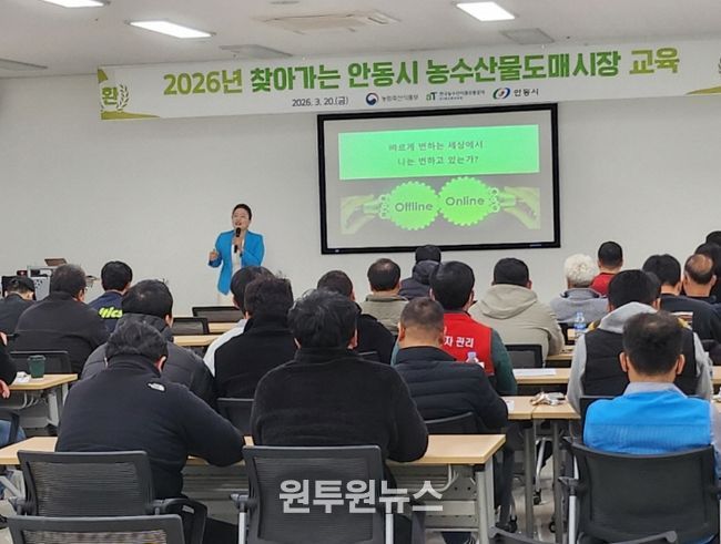 (원투원뉴스) 안동시농수산물도매시장은 3월 20일 수산물도매시장 2층 중회의실에서 법인 임직원, 중도매인 등 유통종사자 80여 명을 대상으로 2026년 찾아가는 도매시장 현장 교육을 실시했다.