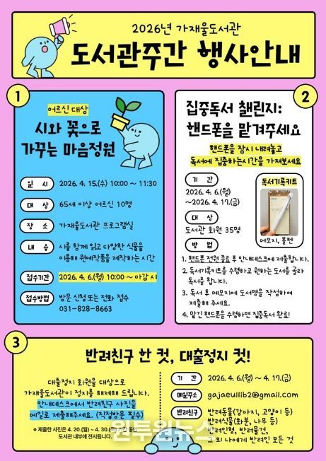 이 외에도 대출정지 회원을 위한 이벤트 ‘반려친구 한 컷, 대출정지 컷!’도 진행한다. 반려친구 사진을 이메일로 제출하면 대출정지를 해제하는 행사로, 반려친구의 범위는 반려동물뿐만 아니라 반려식물, 반려인형, 반려물건 등 개인에게 의미 있는 대상까지 폭넓게 포함한다. 자세한 사항은 도서관 누리집을 참고하거나 가재울도서관(031-828-8663)으로 문의하면 안내받을 수 있다.