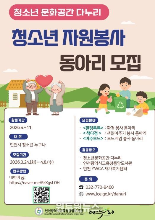 (원투원뉴스) 인천광역시교육청중앙도서관 청소년문화공간 ‘다누리’는 3월 24일부터 4월 8일까지 인천 관내 청소년을 대상으로 자원봉사 동아리 참여자를 모집한다.