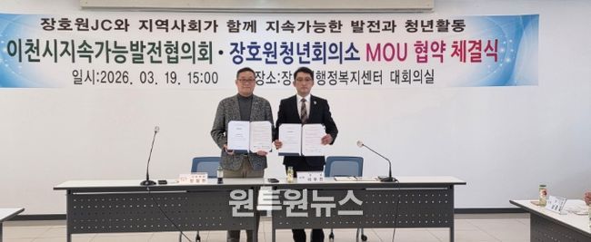 (원투원뉴스) 이천시지속가능발전협의회는 지난 3월 19일, 장호원읍행정복지센터 대회의실에서 장호원청년회의소와 지역사회 청년활동의 리더십 과제 협업을 위한 업무협약(MOU)을 체결했다고 밝혔다.