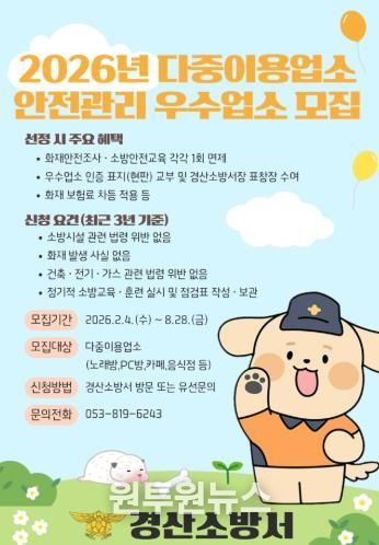 (원투원뉴스) 경산소방서는 다중이용업소 관계인의 자율안전관리 문화 정착과 안전한 영업 환경 조성을 위해 ‘2026년 다중이용업소 안전관리 우수업소’를 선정한다고 밝혔다.