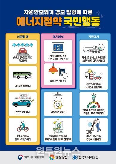 (원투원뉴스) 경상남도는 중동 상황 등으로 인한 국제유가 급등 등 국가적 자원안보 위기에 대응하고 공공기관의 에너지절약 분위기 확산을 위해 24일부터 고강도 에너지 절약 대책을 시행한다고 밝혔다.