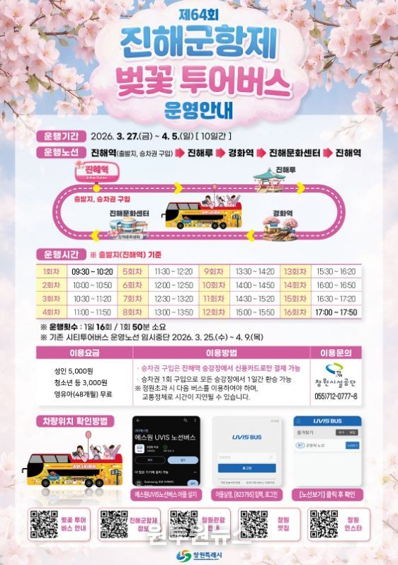 (원투원뉴스) 창원특례시는 오는 3월 27일부터 4월 5일까지 열흘간 제64회 진해군항제와 연계한 ‘벚꽃 투어버스’ 특별 노선을 운영한다.