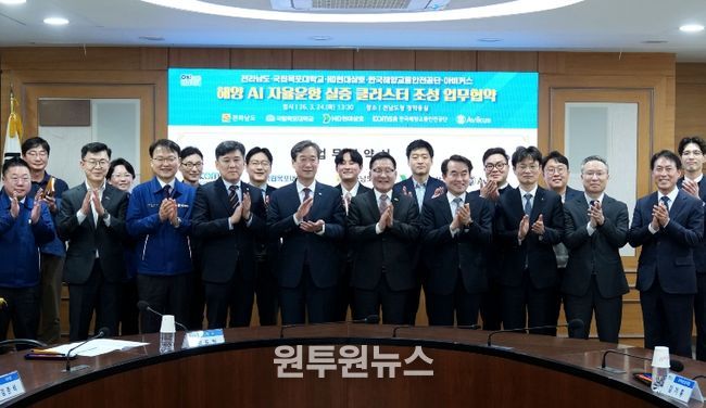 (원투원뉴스) 전라남도는 선박 운항 안전관리와 예방체계 구축을 위해 24일 도청에서 국립목포대학교, HD현대삼호, 한국해양교통안전공단(KOMSA), 아비커스와 함께 해양 인공지능(AI) 자율운항 실증 클러스터 조성 업무협약을 했다.