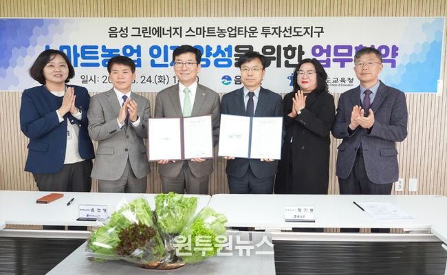 (원투원뉴스) 음성군은 24일 H&A 스마트팜과 그린에너지 스마트농업타운 대상지 일원에서 충청북도교육청과 함께 지역 교육발전 방향과 미래 인재 양성 협력방안을 모색하기 위한 정책간담회를 열고 공동협약을 체결했다.