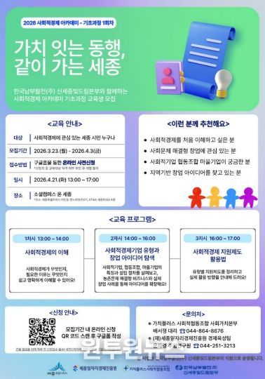 (원투원뉴스) 세종일자리경제진흥원이 한국남부발전㈜ 신세종빛드림본부와 협력해 지역 내 사회적경제 인재를 발굴하고 창업을 지원하기 위한 ‘2026 사회적경제 아카데미’를 운영한다.