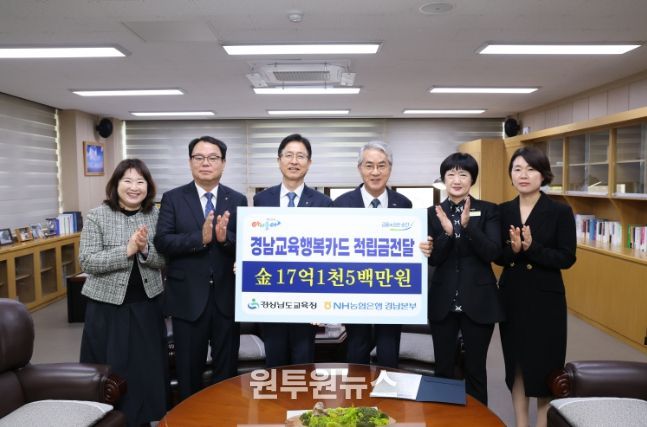 (원투원뉴스) 경상남도교육청은 24일 NH농협은행으로부터 ‘경남교육행복카드’ 사용으로 적립된 포인트 17억 1,585만 6,930원을 전달받았다.