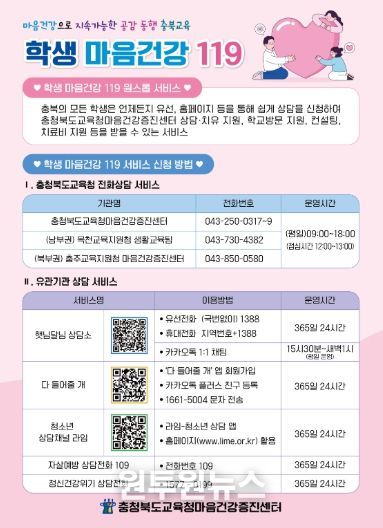 (원투원뉴스) 충청북도교육청은 새 학기를 맞아 학생들이 새로운 환경에 안정적으로 적응하고 건강하게 성장할 수 있도록 '학생 마음건강 119' 서비스를 상시 운영하며 학생 마음건강 지원을 강화하고 있다고 밝혔다.