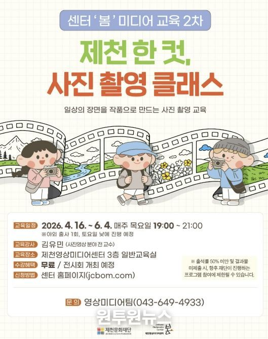 이번 교육은 단순한 기술 습득이 아닌, 시민들이 제천의 일상과 풍경을 직접 기록할 수 있도록 기획된 프로그램으로, 제천영상미디어센터 3층 일반교육실에서 4월 16일부터 6월 4일까지 매주 목요일 오후 7시에 총 8회에 걸쳐 운영된다.