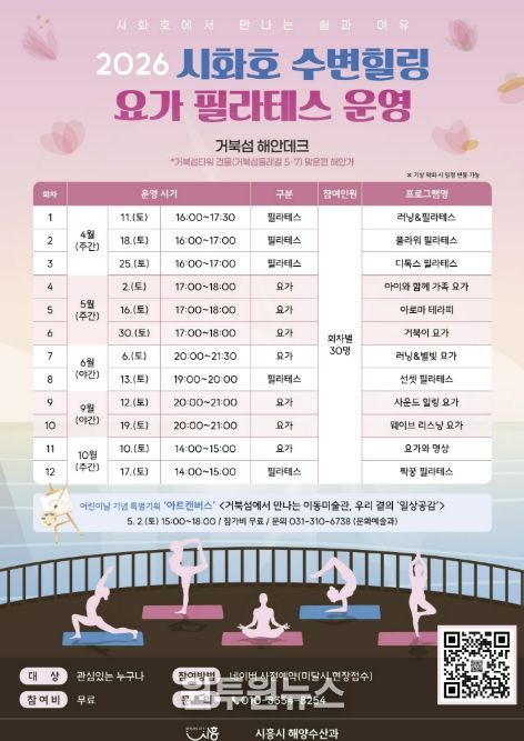 (원투원뉴스) 시흥시는 시화호 수변의 자연경관을 활용해 시민들에게 일상의 여유와 휴식을 제공하는 ‘시화호 수변 힐링 프로그램’을 오는 4월 11일부터 10월 17일까지 운영한다.