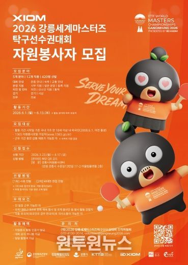 (원투원뉴스) 강릉시에서 열리는 ‘XIOM 강릉세계마스터즈탁구선수권대회’의 성공적인 개최를 위해 대회 조직위원회가 3월 23일부터 4월 17일까지 자원봉사자를 모집한다고 밝혔다.
