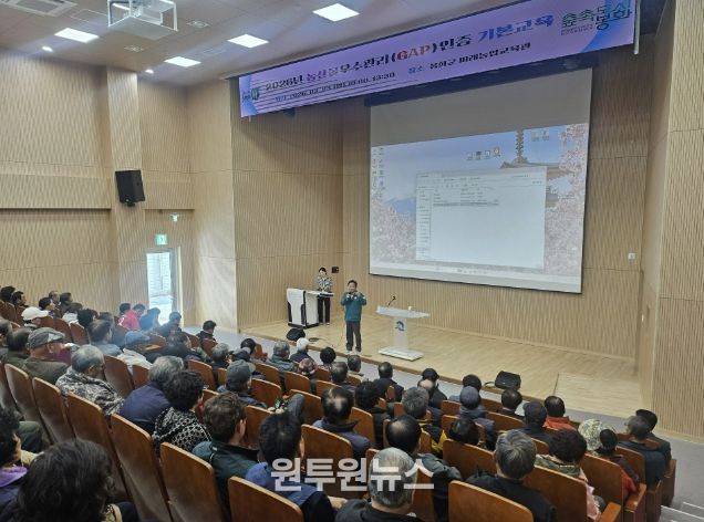 (원투원뉴스) 봉화군은 안전한 농산물 생산에 주력하기 위해 지난 23일 신규농가 및 갱신농가 400여 명을 대상으로 미래농업교육관에서 GAP(농산물우수관리) 인증 기본 교육을 실시했다.