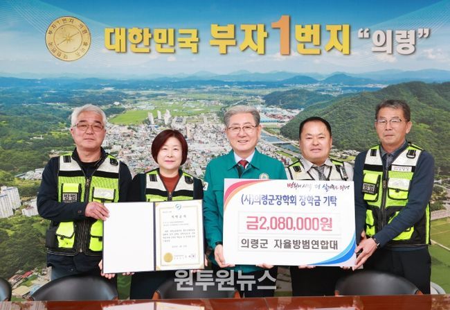 (원투원뉴스) 의령군은 지난 23일 의령군 자율방범연합대(회장 강철석)가 지역 인재 양성을 위해 (사)의령군장학회에 장학금 208만원을 기탁했다고 밝혔다.
