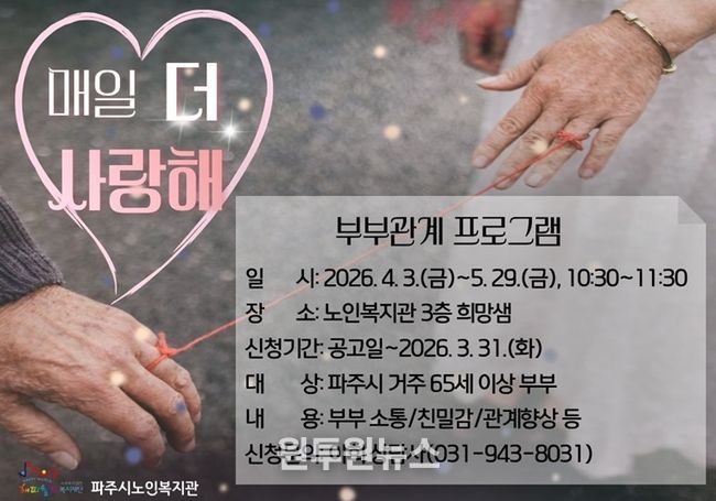 파주시 관계자는 “이번 ‘매일 더 사랑해’프로그램을 통해 어르신 부부들에게 새로운 소통의 기회를 제공하고, 공감과 이해를 바탕으로 더욱 따뜻한 노후를 만들어가는 계기가 되길 바란다”라고 전했다.