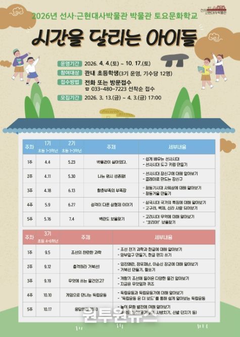 (원투원뉴스) 양구 선사·근현대사박물관은 4월 4일부터 10월 17일까지 초등학생을 대상으로 토요문화학교 ‘시간을 달리는 아이들’을 운영한다.