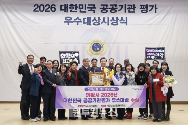 (원투원뉴스) 의왕시가 3월 24일 국회의원회관 대회의실에서 열린 ‘2026 대한민국 공공기관평가 우수대상’시상식에서‘정책소통·적극행정 부문’에 선정되는 영예를 안았다.