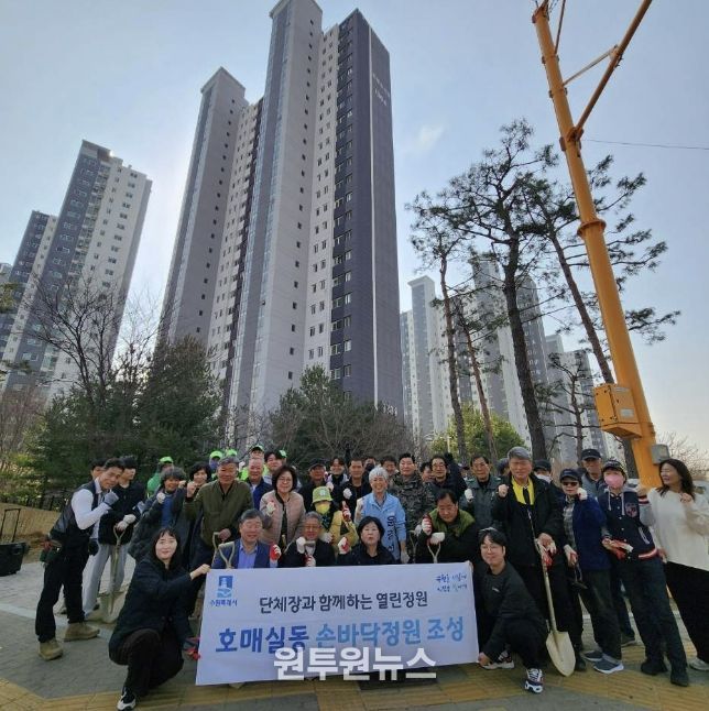 (원투원뉴스) 지난 24일, 수원시 권선구 호매실동은 쾌적한 마을 환경 조성과 도심 속 정원 문화 확산을 위해 아파트 단지 인근 유휴지에 ‘손바닥 정원’을 조성했다.