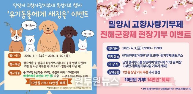 참여 방법은 고향사랑e음 누리집에 접속해 ‘특정사업 기부하기’ 메뉴에서 경상남도 밀양시 ‘유기동물 입양 지원사업’을 선택해 기부하면 자동으로 응모된다. 당첨자는 5월 8일까지 개별 안내될 예정이다.