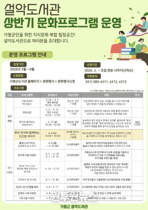 가평군도서관 관계자는 “이번 프로그램을 통해 주민들이 독서의 즐거움을 체감하고, 설악도서관에서 꿈과 희망을 키워가는 계기가 되길 바란다”고 말했다.
