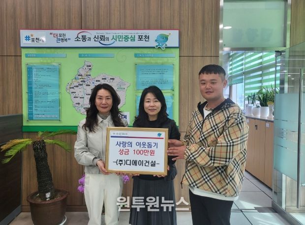 (원투원뉴스) 포천시 신읍동 소재 ㈜디에이건설은 지난 24일 지역 내 어려운 이웃을 돕기 위해 가산면 행정복지센터에 성금 100만 원을 기탁했다.