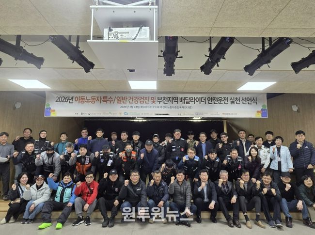 (원투원뉴스) 부천시는 지난 24일 부천시노동자종합복지관에서 이륜차 사고 예방과 안전한 배달문화 정착을 위해 ‘2026년 이동노동자 건강검진 및 부천지역 배달 라이더 안전운전 실천 선언식’을 열었다.