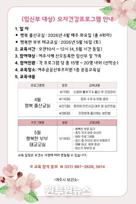 (원투원뉴스) 여주시 건강증진과는 관내 임산부가 출산에 대한 전반적인 지식과 기술을 습득하여 건강하고 행복한 출산이 되도록 2026년도 상반기 '출산준비교실' 운영한다.