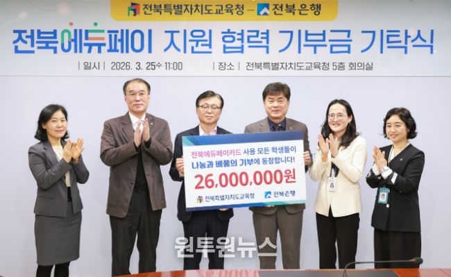 전북교육청과 전북은행은 25일 본청 5층 회의실에서 전북에듀페이 지원 협력사업 기부금 기탁식을 개최했다.