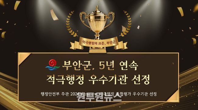 (원투원뉴스) 부안군은 행정안전부에서 주관한 2026년(2025년 실적) 지방정부 적극행정 종합평가에서 우수기관으로 선정돼 지난 2021년 하반기 성과 점검부터 5년 연속 우수기관 선정이라는 금자탑을 쌓았다고 밝혔다.
