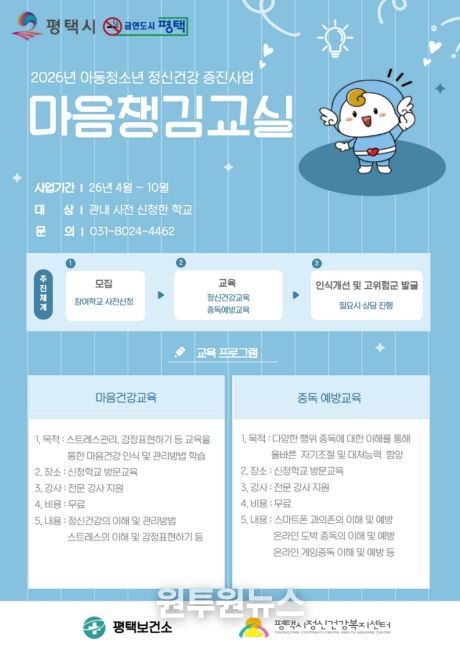 (원투원뉴스) 평택시는 스쿨케어 사업의 일환으로 관내 학교 학생들을 대상으로 『마음챙김교실』을 운영한다고 밝혔다. 이번 프로그램은 학생들이 교육을 통해 정신건강을 올바르게 인식하고 스스로 관리할 수 있도록 지원함으로써 마음 건강 증진을 도모하는 데 목적이 있다.