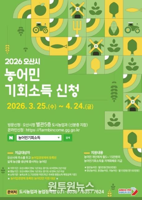 (원투원뉴스) 오산시는 농업·농촌의 공익적 가치 보장과 농어촌 소멸위기 대응을 위해 ‘2026년 농어민 기회소득’ 신청·접수를 3월 25일부터 4월 24일까지 진행한다고 밝혔다.