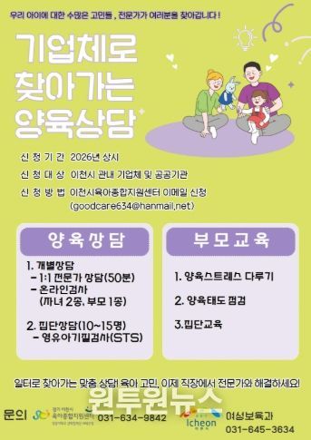 (원투원뉴스) 이천시는 맞벌이나 교대근무 등 열악한 근무 여건으로 인해 양육 정보 접근에 어려움을 겪는 부모들을 위해 ‘기업체로 찾아가는 양육상담 서비스’를 본격 운영하다고 밝혔다.