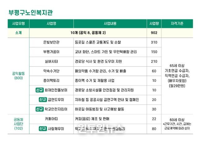 금년도 일자리사업은 은빛보안관(등굣길 교통지도 및 순찰), 부평가꿈이(학교 화단 및 시설 관리), 실버시터(경로당 식사 및 청소), 약속수거단(폐의약품 수거), 종이팩토리(우유팩 재활용), 화재안전돌보미(경로당 소방시설 점검), 금연도우미(공공장소 금연 안내), 학교안전지킴이(하굣길 안전 및 범죄 예방)이며, 카페아띠(복지관 커피매장), 사랑채우미(학교 급,배식 및 환경정리) 등 다양하게 운영되고 있다.
