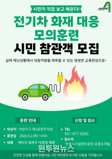 (원투원뉴스) 안성시시설관리공단은 오는 4월 2일 목요일 오후2시 안성시 옥산동 소재 아양지구 제3공영주차장에서 ‘시민과 함께하는 2026년 재난대응 모의훈련’을 실시한다고 밝혔다.