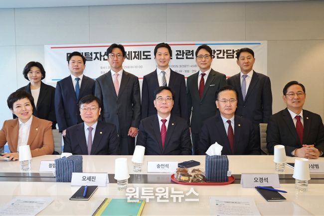 (원투원뉴스) 송언석 국민의힘 원내대표(경북 김천)는 3월 25일 오전 10시, 서울 여의도 코인원 본사에서 '디지털자산 과세제도 개선 관련 현장간담회'를 개최했다.