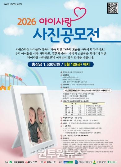 (원투원뉴스) 대구광역시는 3월 26일부터 5월 1일까지 아이와 가족이 함께하는 행복한 순간을 담은 ‘2026 아이사랑 사진 공모전’을 개최한다.