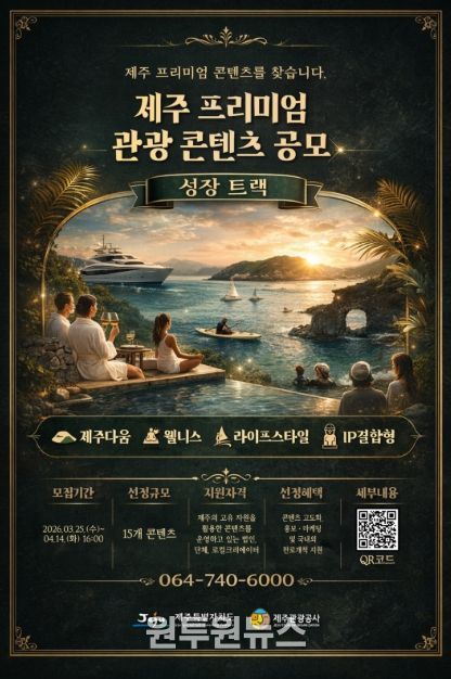 (원투원뉴스) 제주특별자치도와 제주관광공사(사장 고승철)는 오는 4월 14일까지 온라인 채널을 통해 제주관광의 질적 전환과 콘텐츠 경쟁력 강화를 위해 ‘트렌드 선도 프리미엄 관광 콘텐츠(성장 트랙)’ 공모 사업을 추진하고 있다고 25일 밝혔다.