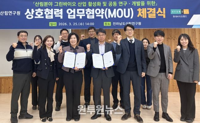 (원투원뉴스) 전라남도산림연구원이 25일 ㈜현대바이오랜드와 산림자원을 활용한 그린바이오 산업 활성화를 위해 업무협약을 하고, 고부가가치 제품 개발과 원물의 안정적 생산체계 구축을 위한 상호 협력에 나섰다.