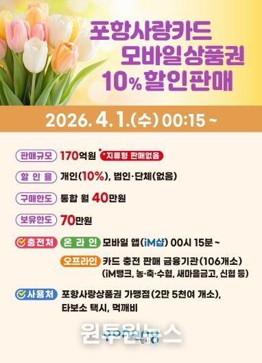 (원투원뉴스) 포항시가 지역 경제에 활력을 불어넣기 위해 내달 1일부터 카드형·모바일 포항사랑상품권(포항사랑카드) 170억 원을 10% 할인된 금액으로 판매한다.