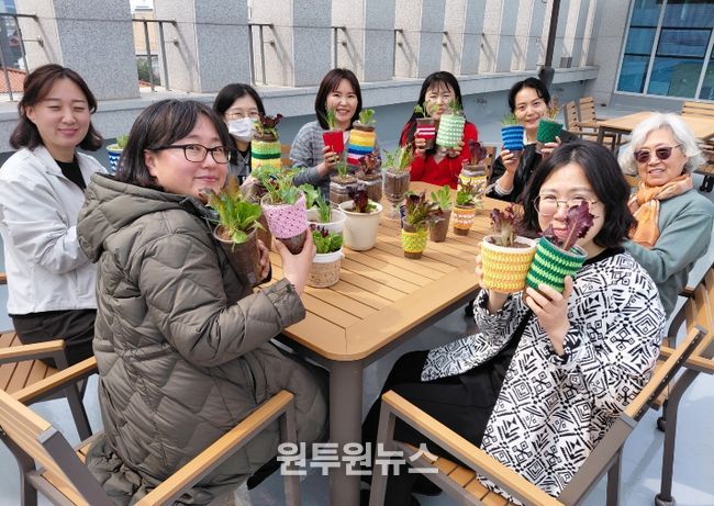 참여 학부모들은 세척한 폐페트병을 화분으로 제작하고, 이전 활동에서 남은 자투리 실을 활용해 화분 커버를 만드는 등 자원 재활용의 의미를 체험했다.