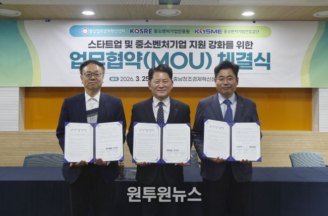 (원투원뉴스) (재)충남창조경제혁신센터는 25일 중소기업벤처인증원, 중소벤처기업진흥공단 충청연수원과 스타트업 및 중소벤처기업의 성장 지원을 위한 업무협약(MOU)을 체결했다고 밝혔다.
