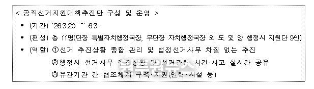 소통청렴담당관이 총괄하고 3개 반 10명의 감찰 인력이 투입되며, 공직자의 선거중립 의무 위반, 민생현안 방치, 선심성 예산집행, 공직기강 해이 등을 집중 점검한다.