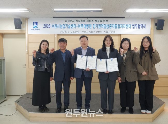 (원투원뉴스) 수원특례시와 아주대병원 경기권역암생존자통합지지센터는 25일 농업기술센터 2층 세미나실에서 ‘암 생존자 치유농업 서비스 제공을 위한 업무협약’을 체결하고, 협력을 약속했다.