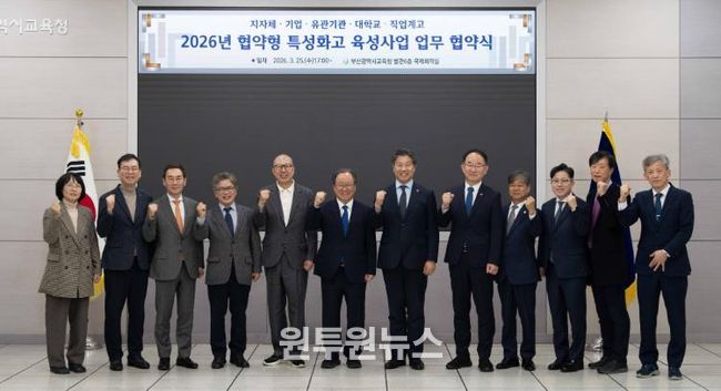 부산시교육청은 지난 25일 오후 교육청 국제회의실에서 부산시, HJ중공업, 아이큐랩, 국립한국해양대, 동의대, 부산테크노파크, 한국조선해양플랜트협회, 경남공고, 금샘고와 ‘2026년 협약형 특성화고 육성지원 업무협약’을 체결했다고 밝혔다.
