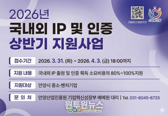 (원투원뉴스) 안양산업진흥원이 안양시 소재 중소·벤처기업의 지식재산권 확보와 글로벌 품질 신뢰도 제고를 위해 ‘2026년도 국내외 IP(지식재산권) 출원 및 인증 상반기 지원사업’ 참가 기업을 모집한다고 25일 밝혔다.