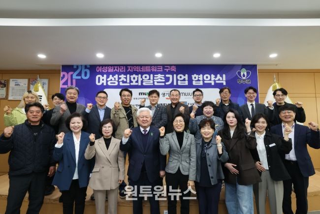 (원투원뉴스) 무주군이 ‘여성 일자리 창출’ 및 지원에 나서며 큰 관심을 끌고 있다. 무주군에 따르면 지난 26일 주식회사 떡갈나무 등 지역 내 15개 기관·기업과 ‘여성친화 일촌기업 협약’을 체결하며 협력을 약속했다.
