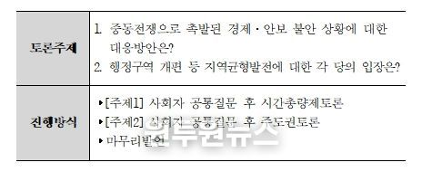 '공직선거법'제82조의3에 따라 개최하는 이번 토론회는 총 5개 정당이 참여하여 ▲ ‘중동전쟁으로 촉발된 경제·안보 불안 상황에 대한 대응방안’, ▲ ‘행정구역 개편 등 지역균형발전에 대한 각 당의 입장’을 주제로 토론할 예정이다.